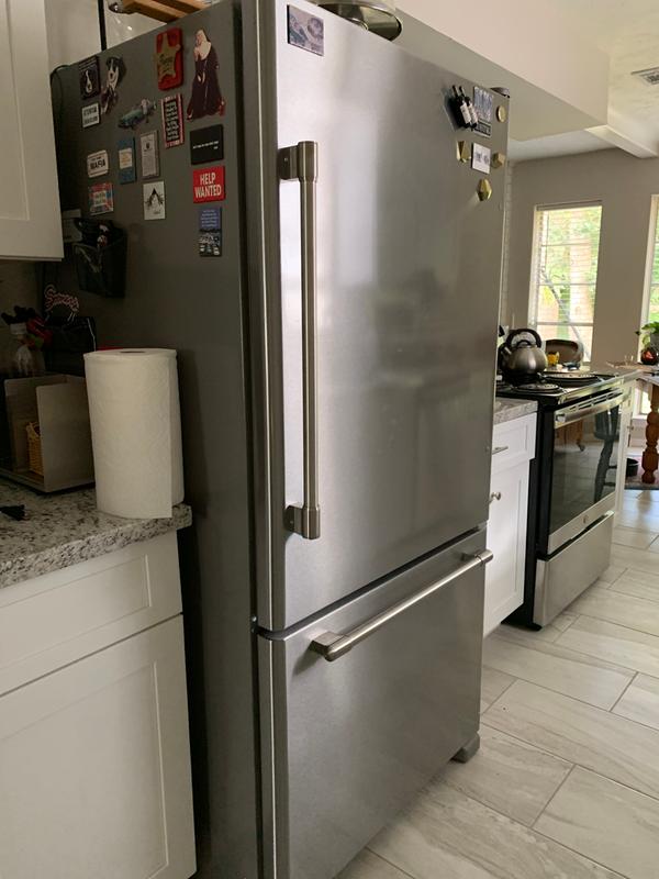 Bottom freezer refrigerator with 5 adjustable spill catcher glass shelves ice maker glide out freezer drawer energy star qualified and electronic temperature controls.